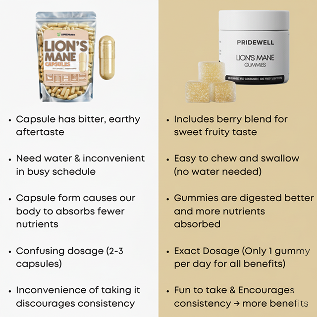 At Pridewell, we use only premium Lion’s Mane mushrooms sourced from trusted farms to craft our daily gummies—designed to help you enjoy clear, focused, and balanced benefits every day.